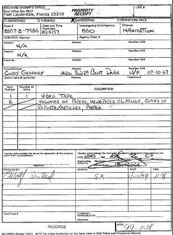 BROWARD SHERIFF'S OFFICE ( BSO ) HOMICIDE DETECTIVE JOHN BERRENA REMOVED LOGGED EVIDENCE (ACE# 97-12241) FOR OVER A YEAR, UNTIL AFTER A TRIAL.  THERE IS NO REFERENCE TO THIS PROPERTY IN THE CHAIN OF CUSTODY, BUT THERE IS IN TRIAL TRANSCRIPTS AND IN STATEMENTS FROM OTHER BSO EMPLOYEES.